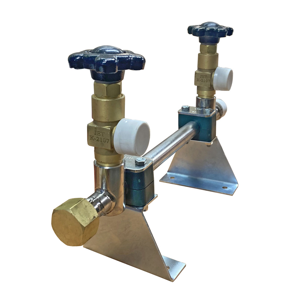 Коллектор рамповый Джет КР-02 2-х вентильный нержавейка предназначен для объединения баллонов в рампу для последующей подачи рабочей среды к потребителю, (используемый материал - сталь коррозионностойкая). Номинальное давление (PN) 200 кгс/см2. Шаг клапанов 240 мм.