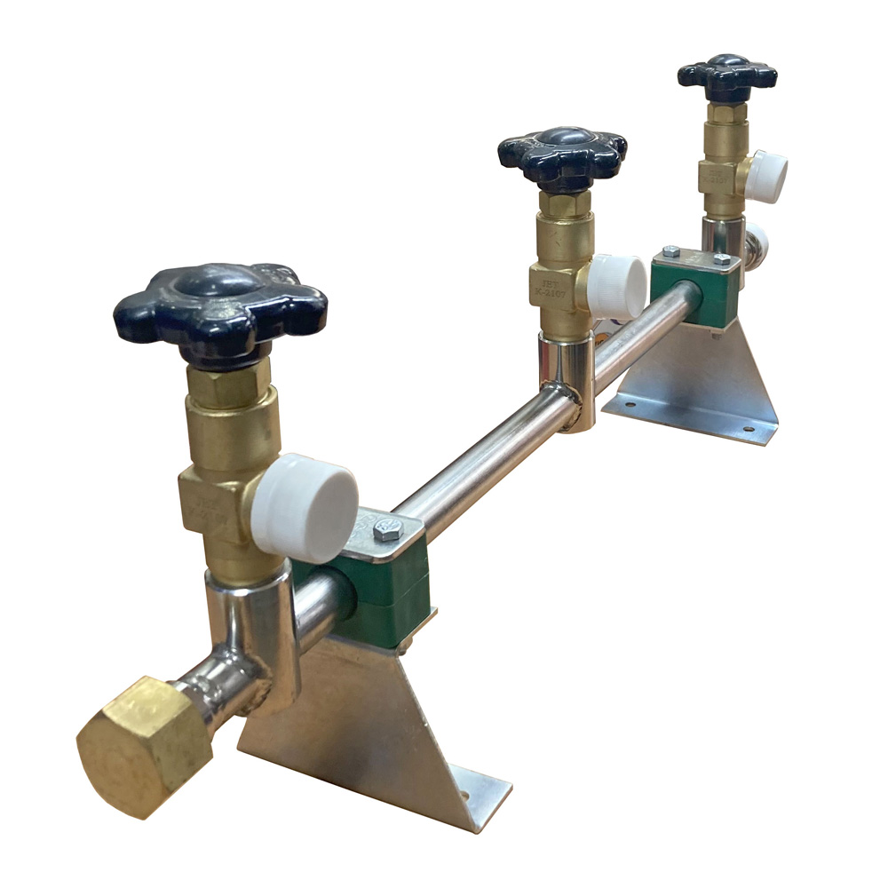 Коллектор рамповый Джет КР-02 3-х вентильный нержавейка предназначен для объединения баллонов в рампу для последующей подачи рабочей среды к потребителю, (используемый материал - сталь коррозионностойкая). Номинальное давление (PN) 200 кгс/см2. Шаг клапанов 240 мм.