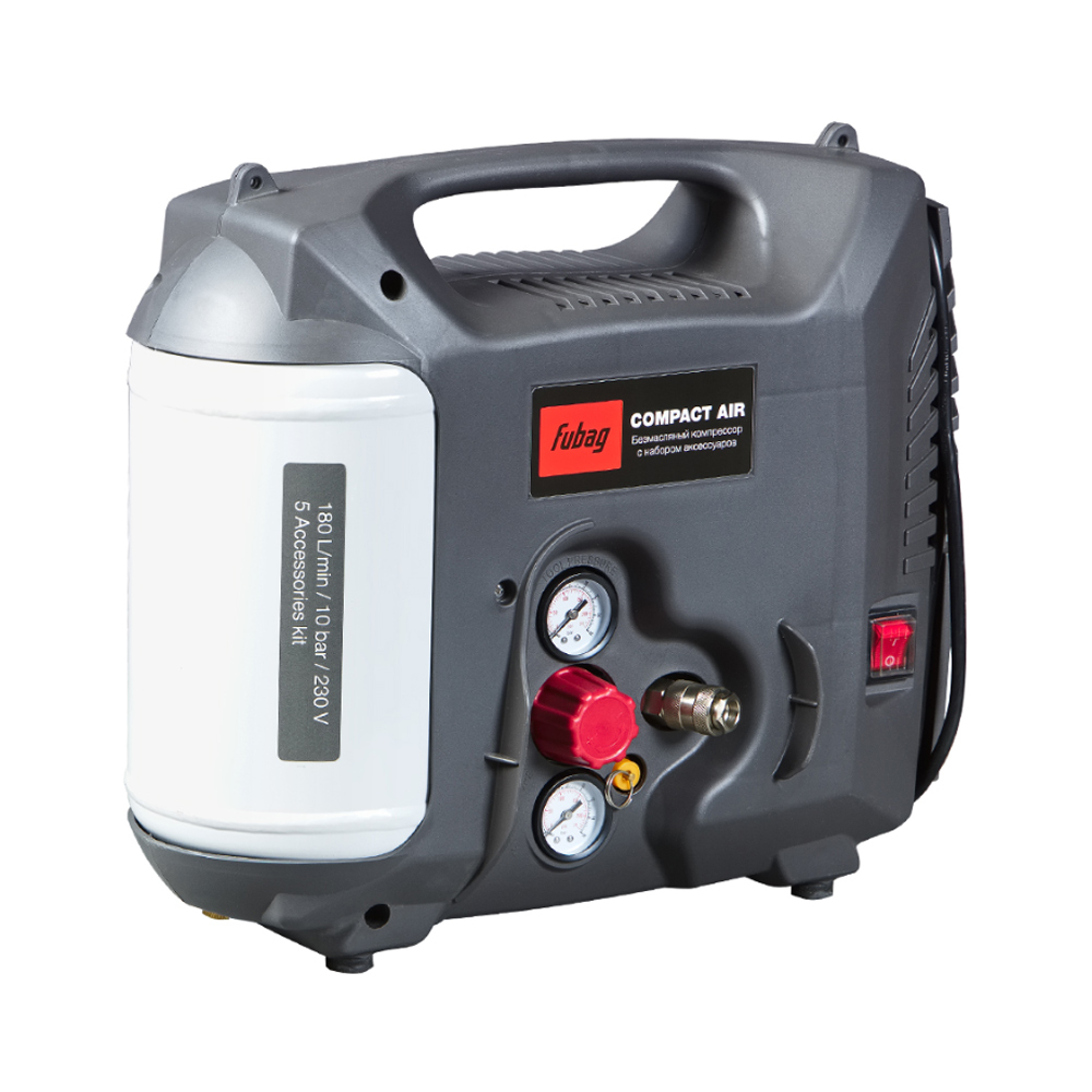 Компрессор безмасляный коаксиальный COMPACT AIR (220 В, 10 бар, 180 л/мин, 1,3 кВт, 8,5 кг, 5 предметов), FUBAG