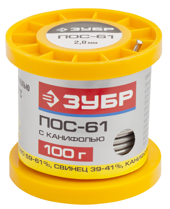 Припой Зубр ПОС-61, ф 2 мм (трубка с канифолью, 100 гр.)