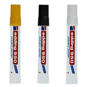 Промышленный маркер Edding-950 заправлен нетоксичными чернилами, которые не размазываются, не растекаются, быстро высыхают. Круглый наконечник, толщина линии письма — около 10 мм. Подходит для маркировки практически любых поверхностей, включая шероховатые и ржавые. Подходит для использования на стройках, на производстве.