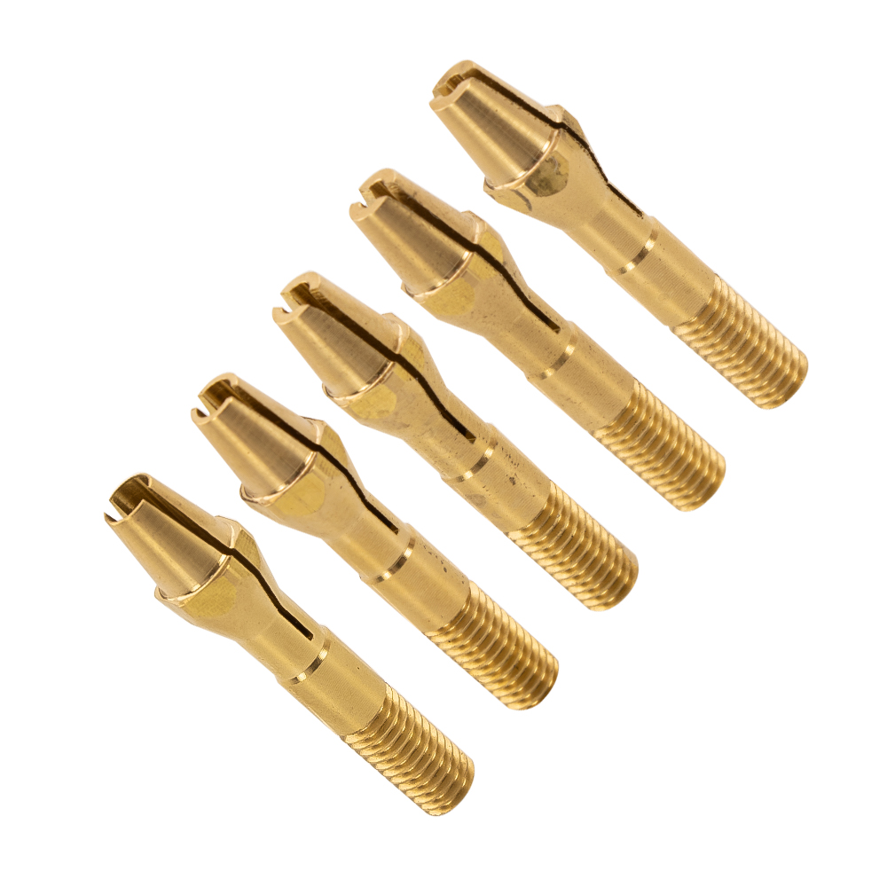 Комплект из пяти различных цанговых зажимов позволяет выбирать нужный в зависимости от диаметра вольфрамового электрода, обеспечивая максимальную точность и качество заточки. Благодаря этим приспособлениям сварщик может легко подобрать подходящий цанговый зажим и безопасно фиксировать электрод, что важно для создания острых и стабильных концов электродов.