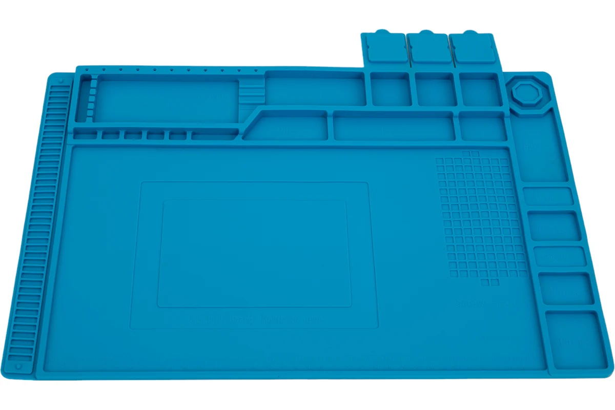 Коврик оборудован магнитами и ячейками, что позволяет удобно организовать рабочее место. Магниты фиксируют небольшие металлические детали и инструменты, предотвращая их потерю, а ячейки предназначены для хранения инструментов, компонентов, проводов и других необходимых элементов.