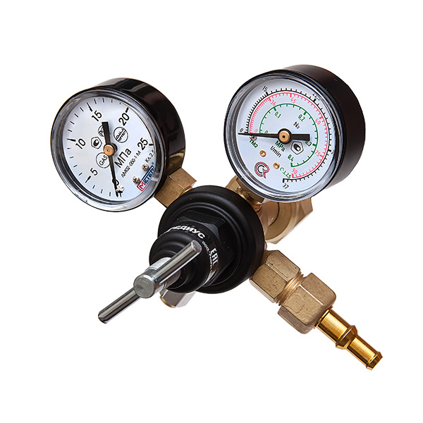 Малогабаритный азотный регулятор выполнен по осевой схеме, за счет чего обладает компактными размерами при сохранении всех рабочих параметров на уровне крупногабаритных регуляторов. Регулятор предназначен для понижения и регулирования давления азота, поступающего из баллона, и автоматического поддержания постоянного рабочего расхода газа на выходе регулятора в ходе проведения работ. Регулятор имеет манометр высокого давления и манометр низкого давления показывающий расход.