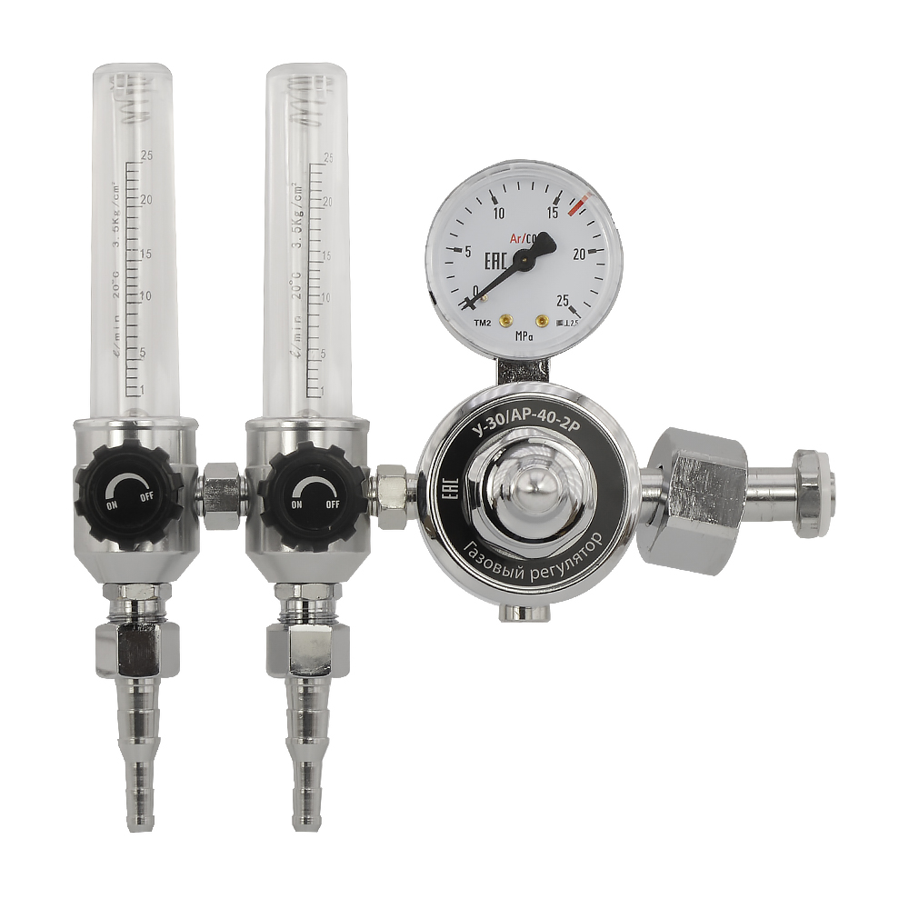Универсальный регулятор расхода газа У-30/АР-40-2Р (с двумя ротаметрами) ВАРИАНТ предназначен для точного снижения давления защитного газа, поступающего из магистрали или баллона, и поддержания стабильного расхода при электросварочных работах. Он оснащен двумя встроенными ротаметрами для измерения расхода газа и манометром для контроля давления на входе, что обеспечивает повышенную точность и контроль в процессе работы.