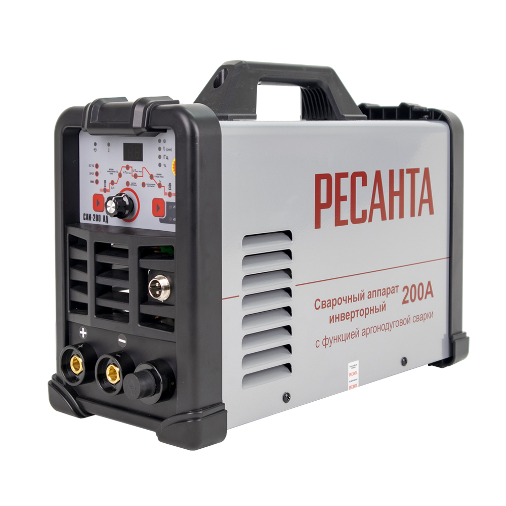 Сварочный аппарат РЕСАНТА САИ-200АД – современный портативный однофазный инверторный сварочный аппарат с функцией аргонодуговой сварки постоянным током (TIG DC). Данный аппарат изготовлен по передовой IGBT технологии. Аппарат позволяет производить: Сварку постоянным током неплавящимся электродом в среде защитного газа углеродистых и нержавеющих сталей (режим TIG). Сварка осуществляется постоянным током в среде аргона. Отличительной особенностью рассматриваемого вида сварки являются два главных компонента: неплавящийся электрод и защитный газ (аргон). Сварка-SPOT позволяет выполнить быстро и качественно соединение листов металлических конструкций с применением местного воздействия тока определенной силы и нагрева свариваемых заготовок. В тех зонах, где электроды касаются металла, происходит его плавление Защита электрической дуги необходима с целью препятствия вступления расплавляемого металла в контакт с окружающей средой, поскольку данное взаимодействие (при окислении азота и кислорода) приводит к образованию оксидов и нитритов, наличие которых в металле приводит к дефектам сварного шва. С этой целью и применяются защитные газы в баллонах, например, аргон. Ручную дуговую сварку штучным покрытым электродом на постоянном токе электродами с рутиловым и основным покрытием (режим ММА). Для сварки электродом защитный газ не требуется