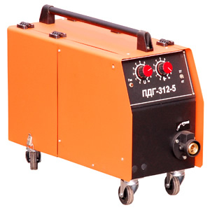 ПДГ-312 - подающий механизм закрытого типа. Внутри установлен 2-х роликовый редукторный привод, кассета для сварочной проволоки, тормозное устройство, плата управления и электромагнитный клапан. На лицевой панели механизма имеются резисторы регулировки длительности режима сварки электродуговыми точками, регулировки скорости подачи сварочной проволоки и напряжения.