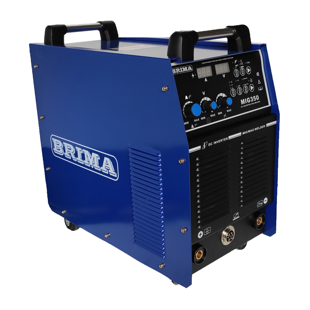 BRIMA MIG-350 DIGITAL – является сварочным инверторным полуавтоматом, предназначенным для сварки сплошной проволокой в защитных газах (данный способ сварки в соответствии с ИСО 4063-90 имеет следующее сокращение – MIG Metal Inert Gas, MAG Metal Active Gas) таких материалов, как углеродистая и легированная стали. В качестве защитных газов используются активные газы (углекислый газ, газовая смесь) при сварке MAG, которые принимают участие в формировании сварного соединения, и инертные – при сварке MIG (аргон, гелий), которые не вступают в химическое взаимодействие с металлами и практически не растворяются в них. Благодаря защите зона сварки не подвергается вредному окислительному воздействию окружающей среды и резко возрастает качество сварного соединения.