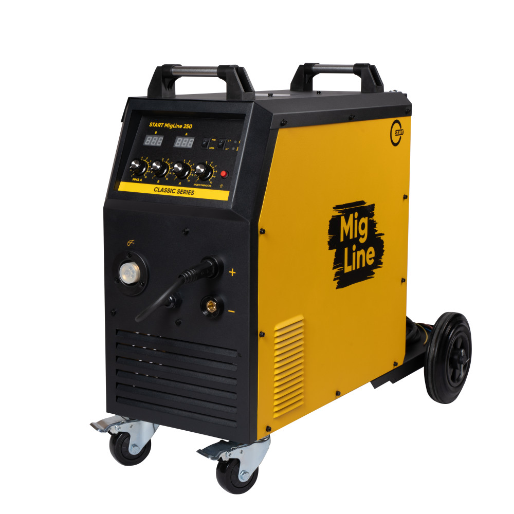 Сварочный полуавтомат инверторного типа START MigLine 250 - мощный и надежный, выполнен в специальном корпусе на передвижной тележке с возможностью легкой транспортировки данного аппарата, предназначенный для полуавтоматической сварки в среде защитных газов (MIG/MAG) и ручной дуговой сварки MMA.