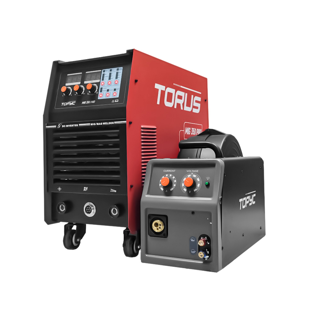 Сварочный полуавтомат ТОРУС МИГ 350 с выносным подающим механизмом проволоки, рассчитан на питание от трехфазной сети 380В и выдает 350А при нагрузке 60%. Работает в широком диапазоне свариваемых материалов: алюминий, магний, титан, никель и др. Конструктивная особенность заключается в отдельном подающем механизме, который можно выносить от источника на длину кабеля управления до 10 метров. Аппарат минимально нагревает изделие, что позволяет работать с тонкими металлами. Показывает высокое качество изготавливаемого шва даже при использовании разнотолщинных деталей.