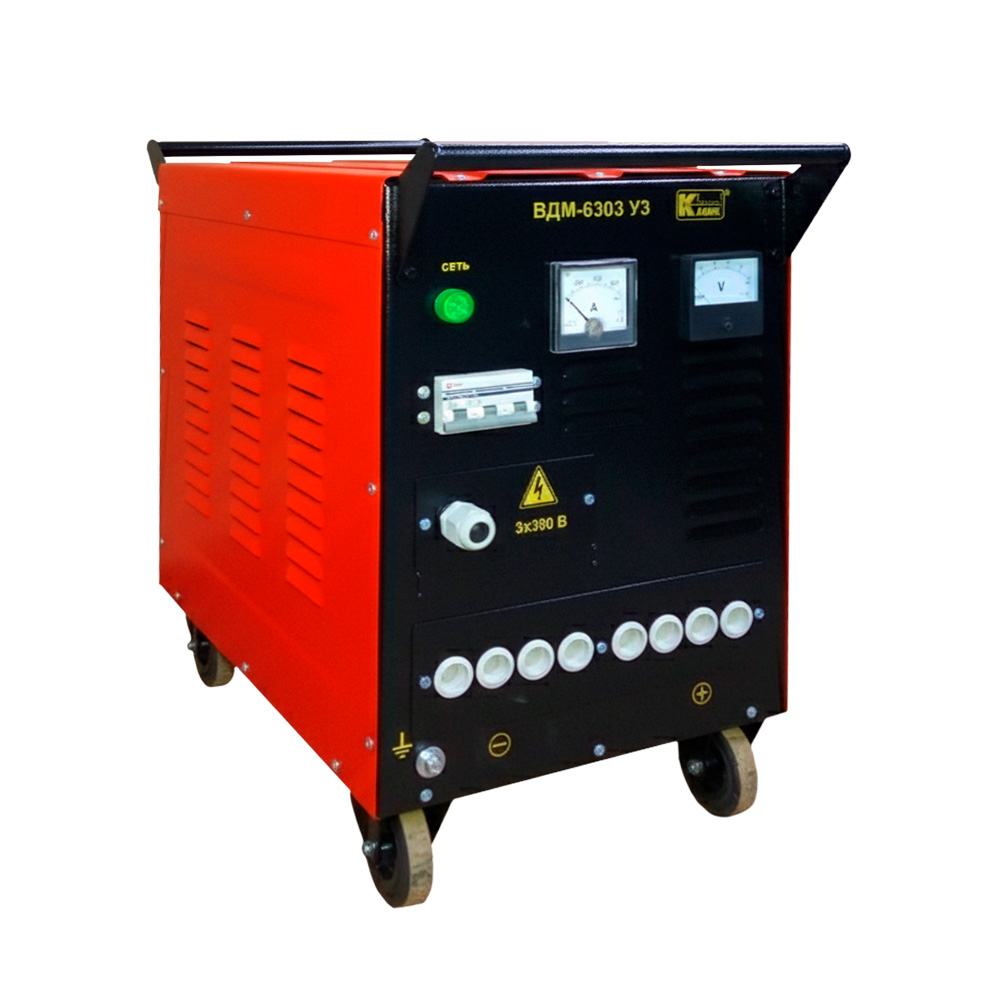 Многопостовой (4-х) выпрямитель ВДМ-6303 предназначен для комплектации постов ручной дуговой сварки покрытыми электродами изделий из углеродистых и легированных сталей на постоянном токе. Подключается к трехфазной сети 380В, выдает номинальный сварочный ток поста 315А при ПН 60%. Снабжен колесами для передвижения по объекту производства.