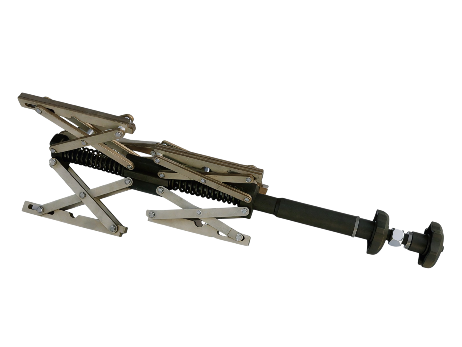 Центратор внутренний предназначен для центрирования заготовок во время сборки сварных конструкций. Оборудование оснащено двумя независимыми расширяющимися зажимами, позволяющими соосно выравнивать соединяемые детали разного диаметра. Нижний расширительный зажим вставляется и зажимается в трубе с помощью ручки. После этого другая часть конструкции (фланец) помещается поверх верхнего расширяющегося зажима и фиксируется с помощью рукоятки.